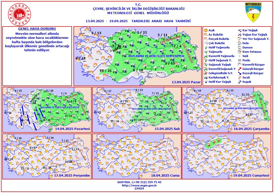 Yurdumuzu etkileyecek soğuk ve yağışlı havayla birlikte 12- 19 Nisan 2025 tarihleri arası Pazar günü: Karadeniz kıyıları, Güneydoğu Anadolu'nun kuzey ve doğusu, Hakkari, Şırnak, Iğdır, Hatay, Kahramanmaraş ile Antalya'nın kuzey ve doğu çevrelerinin yağmur ve sağanak yağışlı, Karadeniz'in iç kesimleri, Ankara çevrelerinde hafif olmak üzere İç Anadolu  ile Doğu Anadolu'nun karla karışık yağmur ve kar yağışlı; Pazartesi günü: Orta ve Doğu Karadeniz kıyıları, Doğu Akdeniz'in doğusu, Doğu Anadolu'nun güneyi, Güneydoğu Anadolu ile Sinop ve Iğdır çevrelerinin yağmur ve sağanak yağışlı, Orta ve Doğu Karadeniz'in iç kesimleri, İç Anadolu'nun doğusu, Doğu Anadolu'nun kuzey kesimleri ile hafif olmak üzere Kastamonu, Çankırı ve Ankara'nın karla karışık yağmur ve kar yağışlı; Salı: Orta ve Doğu Karadeniz kıyıları, Doğu Anadolu'nun güneyi, Güneydoğu Anadolu (Gaziantep dışında) ile Tokat ve Iğdır çevrelerinin yağmur ve sağanak yağışlı, Doğu Karadeniz'in iç kesimleri, Doğu Anadolu'nun kuzeyi ile Niğde, Kayseri ve Sivas çevrelerinin karla karışık yağmur ve kar yağışlı geçeceği tahmin ediliyor. Sabah ve gece saatlerinde iç ve doğu kesimlerde buzlanma ve don olayı beklenmektedir.